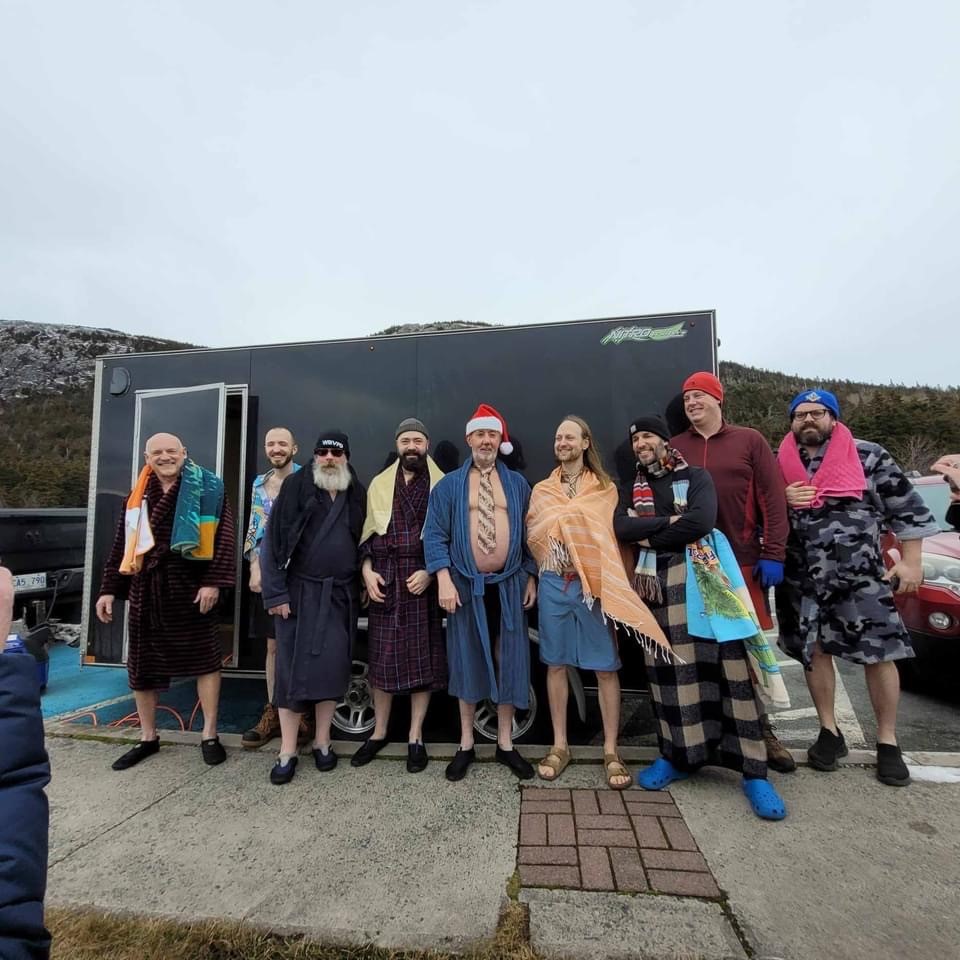 January 1st, 2024, Brethren of Saint John's Lodge No.1 preparing to embrace the frigid January Waters of Topsail Beach, Conception Bay, NL, in support of the Bridges To Hope Charity.